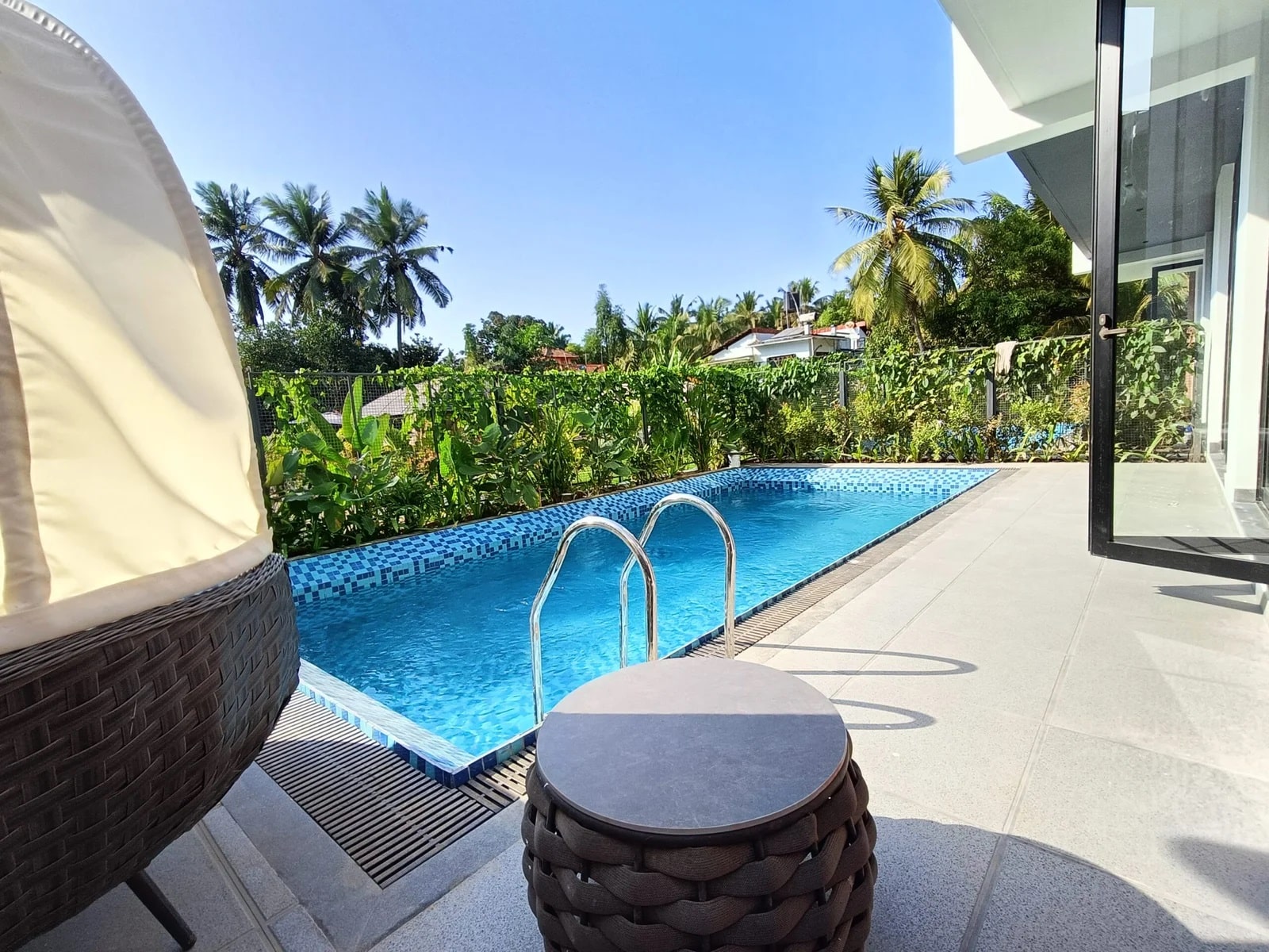 Step outside into the private garden where you can enjoy peaceful evenings. Fire up the BBQ grill and enjoy outdoor dining while watching the sunset. The private pool is perfect for a refreshing swim any time of the day — a highlight of this 3 BHK villa with private pool in Goa for rent.